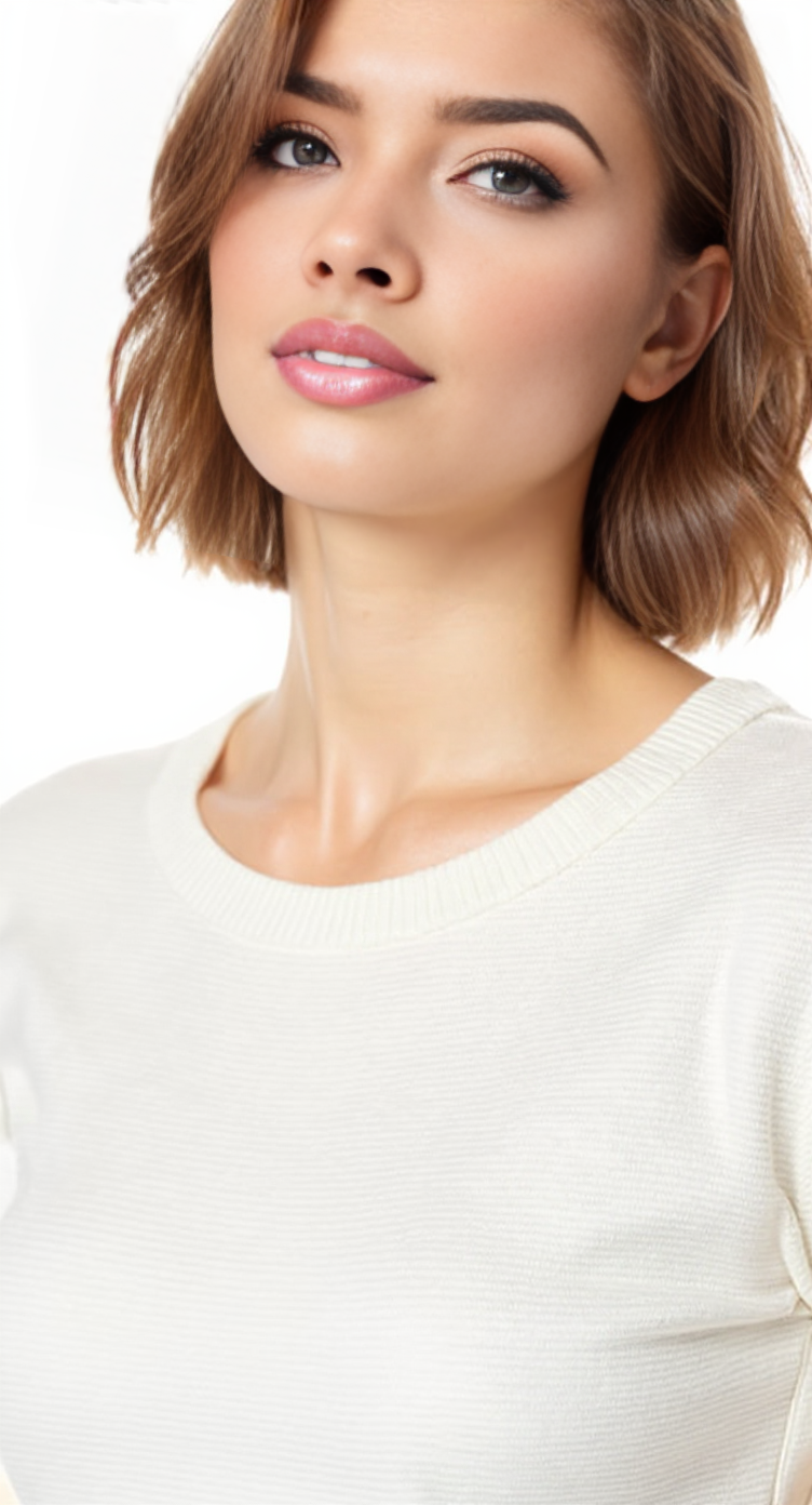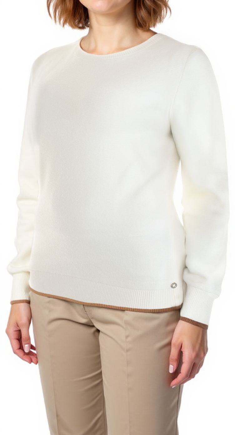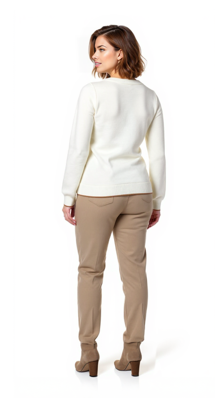 Джемпер Max Mara: нейтральный молочно-белый цвет отлично дополнит любой оттенок, а бежевая окантовка его подчеркнет. 🤍 Продолжение серии AI Fashion Photo Shorts.